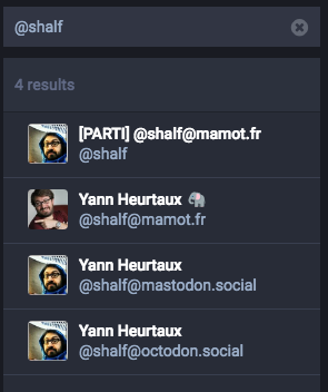 Oui, c'est pénible. Oui, il faut se souvenir des instances. Enfin non, pas tout à fait. Car quand on a déjà parlé à quelqu'un, mastodon se souvient. Et parce que la barre de recherche (juste en dessus de l'espace pour tooter) est plutôt efficace.