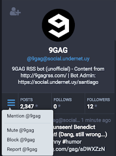 Sous la description du compte, à gauche des décomptes de toot, followers/following, on peut décider de mentionner, muter (= ne plus voir les toots dans les différentes timelines), bloquer ou signaler un compte. (Sur l'application Amaroq, on en peut pas encore signaler un compte, mais on peut faire le reste.)