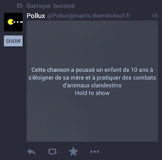 D'autres instances ont choisi d'autres postures avec des textes plus résumés. D'autres instances (très minoritaires, c'est pour l'instant plutôt anecdotique) au contraire ont des attitudes nauséabondes, comme cette instance où les utilisateurs partageaient du contenu pédophile (plus d'infos). Mais sachez que les instances peuvent non seulement bloquer des usagers, mais également bloquer des instances entières. Ce qui est au final garant d'une bien meilleure stabilité et de plus de sécurité pour les usagers que sur une plateforme où des nuées de bots/trolls peuvent se mobiliser n'importe quand contre n'importe qui.